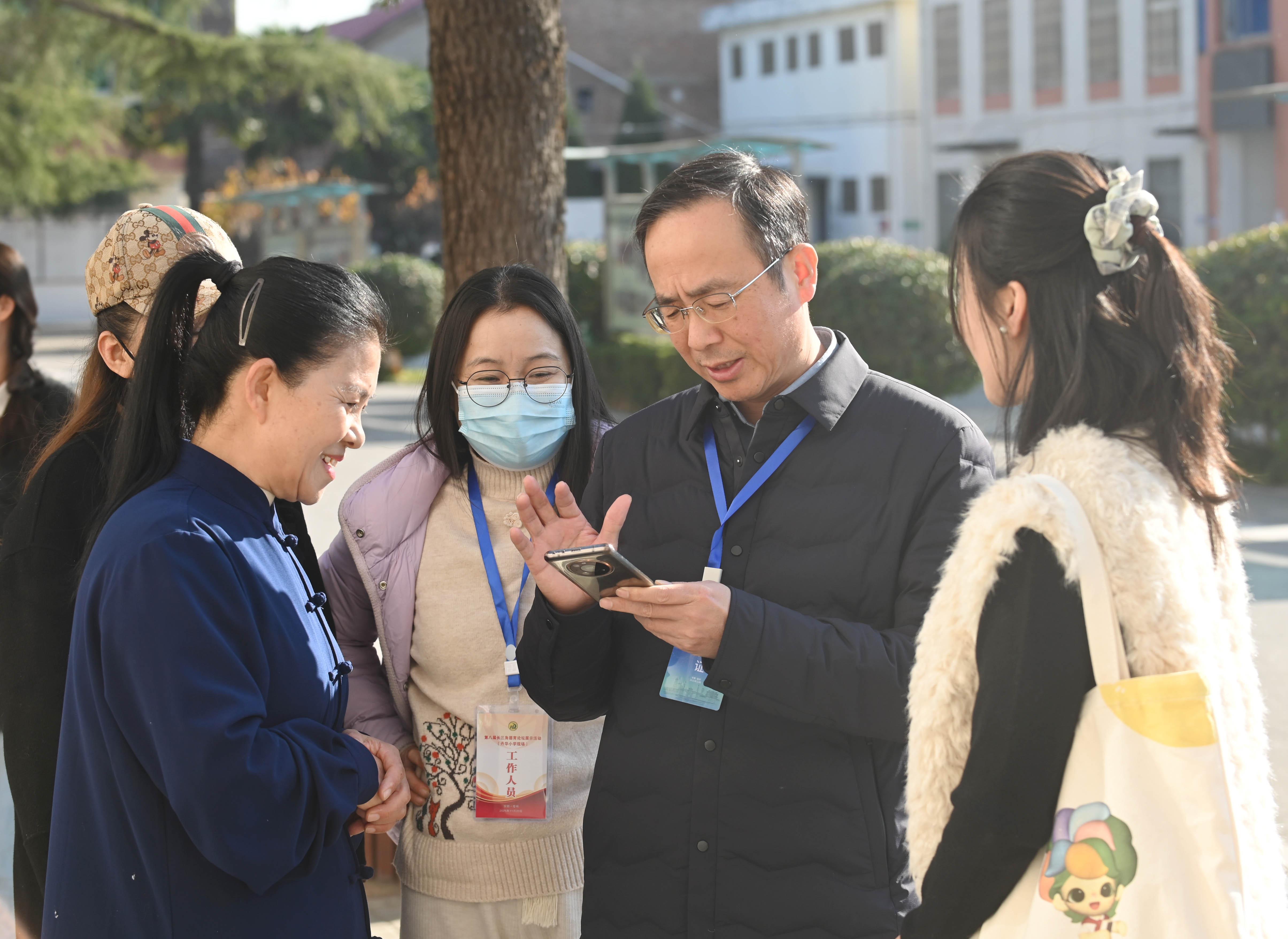 黄山市教育局局长胡勇(右二)对亳州市利用五禽戏开展德育与体育相融合的做法称赞,并主动加微信,希望黄山亳州两市加强合作。