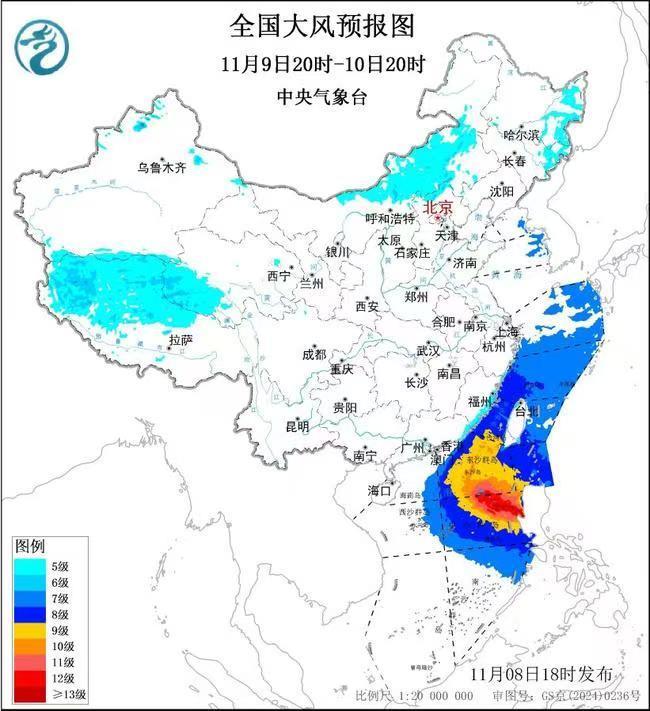 11月9日20时至10日20时,内蒙古中部、东北地区东部、西藏北部和西部、青海西南部、福建东部和广东东部沿海地区等地的部分地区将有5~6级风,阵风7~8级。东海南部海域、台湾海峡、台湾以东洋面、巴士海峡、南海东部海域将有7~8级、阵风9~10级的大风,其中南海东北部和中东部海域的风力可达9~10级,阵风11~12级,台风“凤凰”中心经过的附近海域风力有11~13级,阵风14~15级。