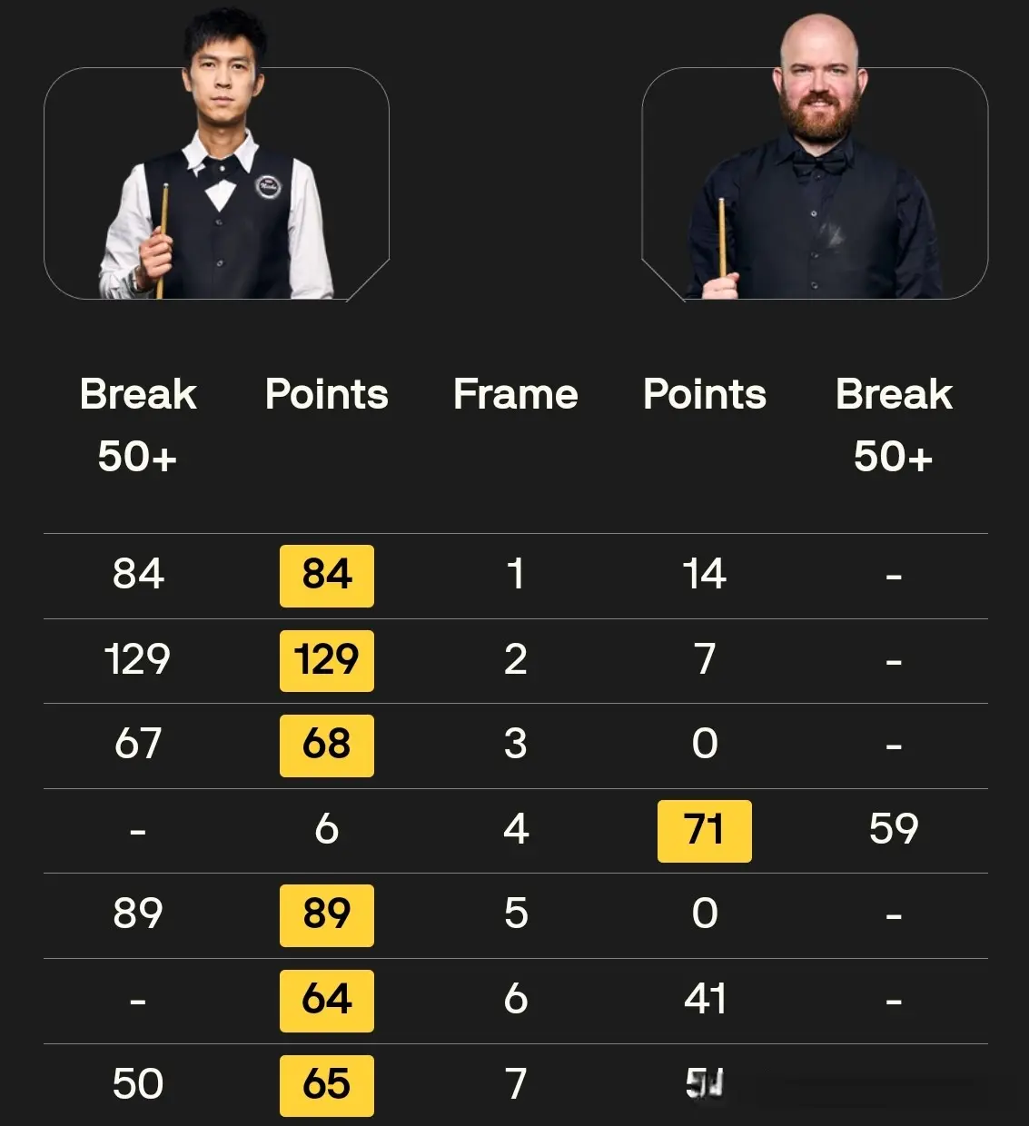 中国选手龙泽煌则单杆打出54分、78分、57分、51分和51分的表现连胜五局以6-1击败爱尔兰名将阿伦·希尔进48强。