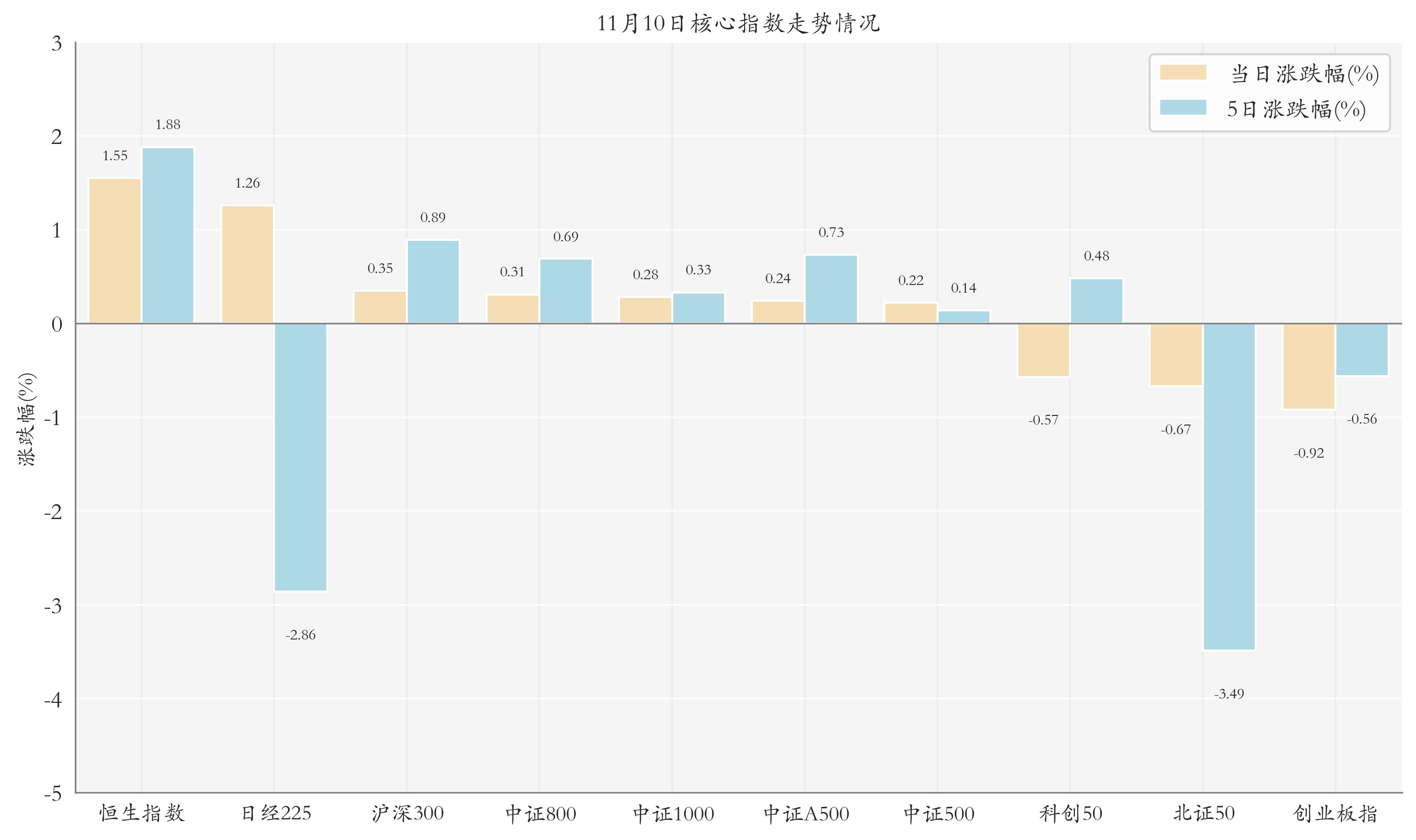 统计A股与海外主要核心指数走势,今日(11月10日,下同)三大指数涨跌不一,其中上证指数上涨0.53%,收于4018.6点,日内最高4018.7点;深证成指上涨0.18%,收于13427.61点,日内最高13502.16点;创业板指下跌0.92%,收于3178.83点,日内最高3236.61点。今日恒生指数、日经225与沪深300走势排名靠前,日涨跌幅分别为1.55%、1.26%与0.35%;近5个交易日恒生指数、沪深300与中证A500的走势排名靠前,近5日涨跌幅分别为1.88%、0.89%与0.73%。
