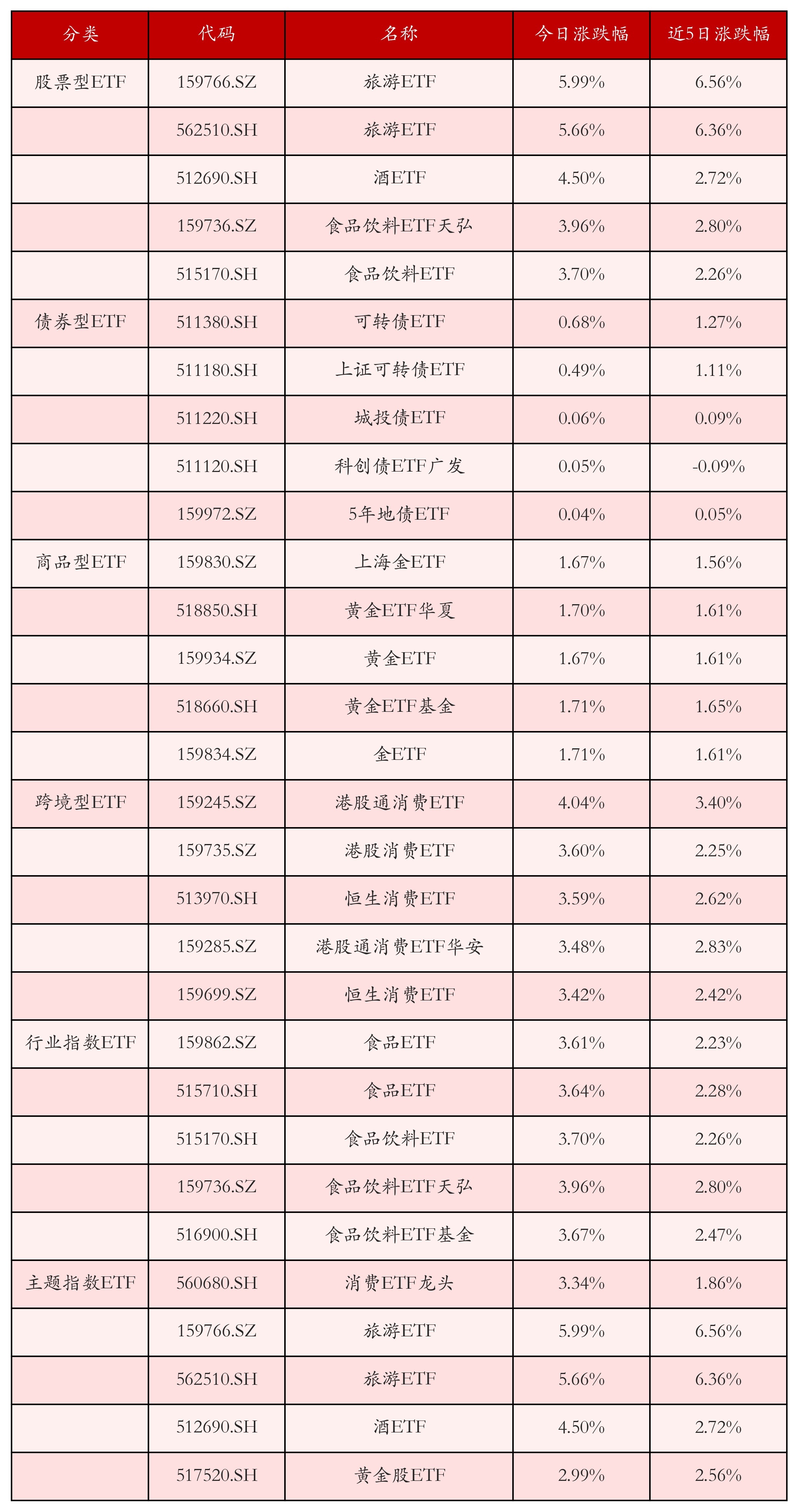 从不同投资种类、行业、主题的ETF产品中找出今日走势行情排名前5的ETF基金,今日涨幅靠前的ETF产品如下表所示。股票型ETF中涨跌幅排名前3位的ETF产品分别为旅游ETF(159766.SZ)、旅游ETF(562510.SH)和酒ETF(512690.SH),今日收益率分别为5.99%、5.66%和4.50%。